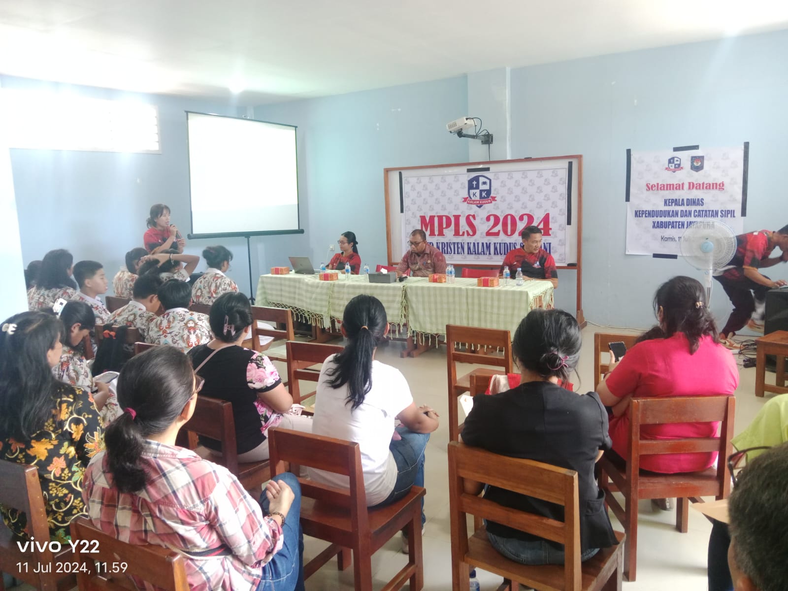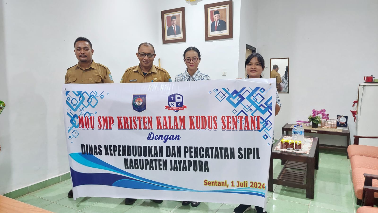 Pada Hari Rabu Tanggal 3 Bulan 07 Tahun 2024 bertempat di Ruang pertemuan Kepala Dinas Kependudukan dan Pencatatan Sipil Kabupaten Jayapura telah dilakukan Penandatanganan Perjanjian Kerjasama antar Dinas Kependudukan dan Pencatatan Sipil Kabupaten Jayapura dan SMP Kristen Kalam Kudus Sentani. Penandatanganan dilakukan oleh Herald Jusuf Berhitu, S.Pd., M.M selaku Kepala Dinas Kependudukan dan Pencatatan Sipil Kabupaten Jayapura dan Anggun P.R.Y. Sinaga,B.Sc.,S.Pd.,Gr.,M.Pd selaku Kepala Sekolah SMP Kristen Kalam Kudus Sentani. Perjanjian kerjasama tentang Percepatan Pencapaian Kepemilikan Dokumen Kependudukan Khususnya Kutipan Akta Kelahiran, Perubahan Kartu Keluarga (KK) dan Kartu Identitas Anak (KIA) Kabupaten Jayapura.